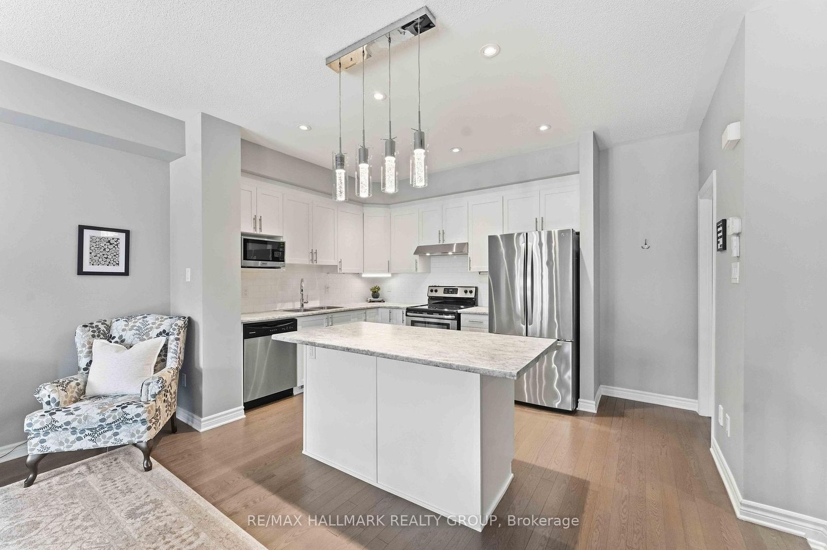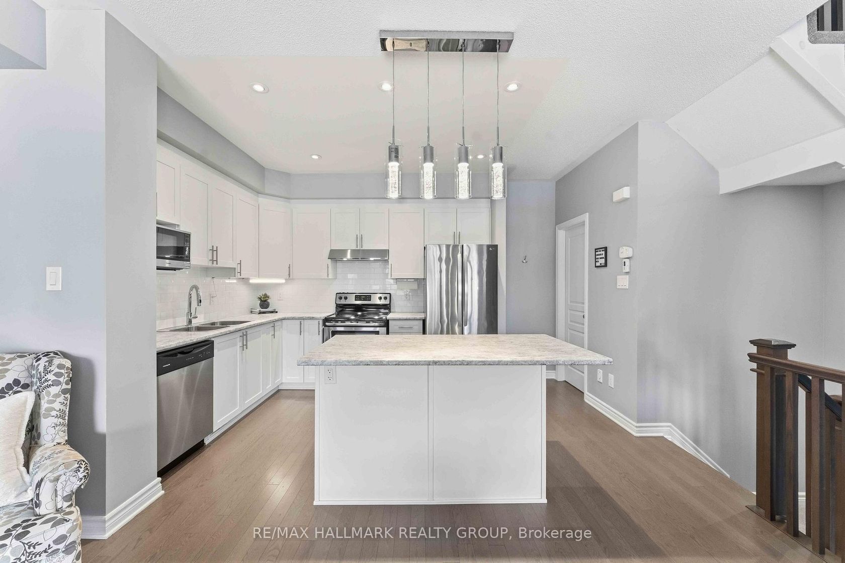 OPEN HOUSE SUN APRIL 26 from 2-4! Welcome to this stunning Richcraft END UNIT townhome, offering modern style, functional living & exceptional natural light throughout. The main level features a versatile den with hardwood flooring, perfect for a home office, gym, or flex space. The bright, open concept second level is designed for both everyday living and entertaining, highlighted by pot lights & beautiful hardwood floors. The contemporary kitchen boasts crisp white cabinetry, a spacious island with seating, and seamless flow into the dining and living areas. Step out onto your private balcony, ideal for morning coffee or evening relaxation. Upstairs, the third level continues with hardwood flooring and offers a generous primary bedroom complete with a walk-in closet and a private ensuite featuring a glass shower. One additional well-sized bedroom, a full main bathroom, and convenient third-floor laundry complete this level. The lower level provides ample storage space, while the extra long garage with built-in shelving adds practical functionality. The widened driveway with interlock allows for additional parking - a rare and valuable feature. Located in a highly desirable, transit-friendly community close to schools, shopping, restaurants, and recreation, this home offers the perfect blend of comfort, style, and convenience.